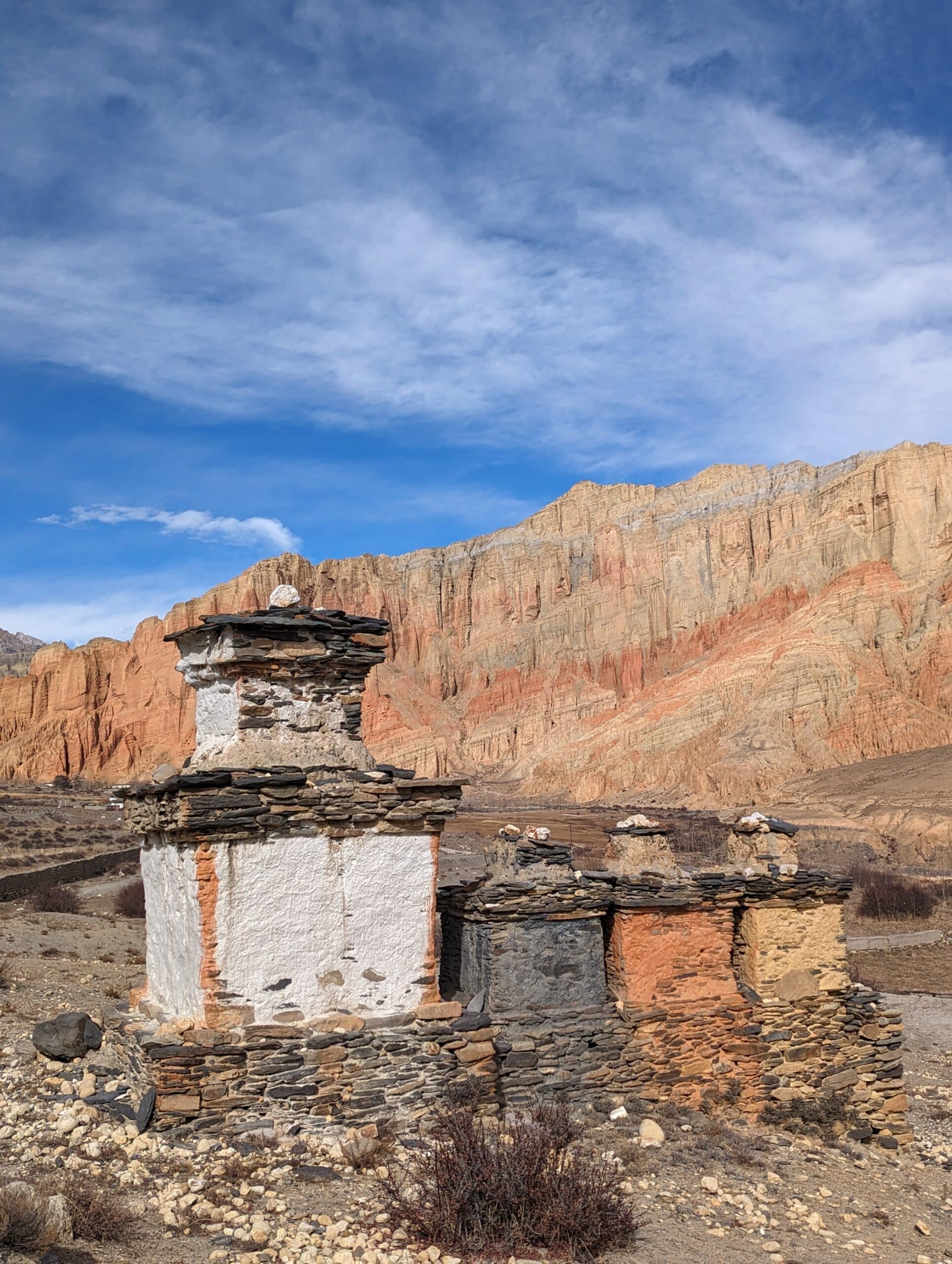 Au départ de Ghiling, si les températures restent froides, un ciel mitigé entre éclaircies et passages nuageux nous donne l’espoir d’un répit météo pour les dix prochains jours de trek qui s’ouvrent. Il est bien connu que l’espoir fait vivre. En tous les cas il nous fait avancer d’un bon pas et passons de petits cols, en vallées. Les paysages sont vraiment spectaculaires. Les éclaircies nous donnent suffisamment de visibilité au loin, pour découvrir cette immensité, cette vison de désert d’altitude. Nous avons la sensation de nous enfoncer au plus profond de l’Himalaya et la promesse de découvrir prochainement cette citée mystérieuse de Lo Mangthan nous galvanise. Nous marchons des heures et des heures et nous ne croisons aucun marcheur, un contraste avec les jours vécus récemment sur le Tour du Manaslu. En traversant le village de Ghami pas plus d’âmes qui vivent. Les récoltes de céréales et de légumes secs sont terminées depuis longtemps, les réserves de foin pour les animaux sont engrangées, seule les cheminées qui fument nous indiquent que les montagnards du Haut Mustang se calfeutrent chez eux. La fumée dégage une odeur acre, on brule des bouses de yacks séchés en guise de combustible. Dans ce désert d’altitude à 4000 m les arbres sont rares, à la faveur de petites haies on y exploite de rares arbres en trogne. Du bois façonné sur place et utilisait pour les besoins de la construction et de la rénovation de l’habitat et des dépendances agricoles. Nous arrivons à Dhakmar notre étape du soir, nous y croisons un trekkeur australien, il arrive de Lo Mangthang qu’il a quitté ce matin avec son guide. Il nous confirme que le village se vide et se prépare à l’hiver. Plus aucun trekkeur là haut. Lui cherche à descendre au plus vite vers Kagbeni et quitter la région. ici à Dhakmar tous les lodges sont déjà fermés, nous sommes dans un village fantôme. Il est surmonté par une immense falaises, percées de grottes sacrées. Ce soir nous dormirons chez l’habitant, avec un confort sommaire et un repas frugal, un vrai luxe.