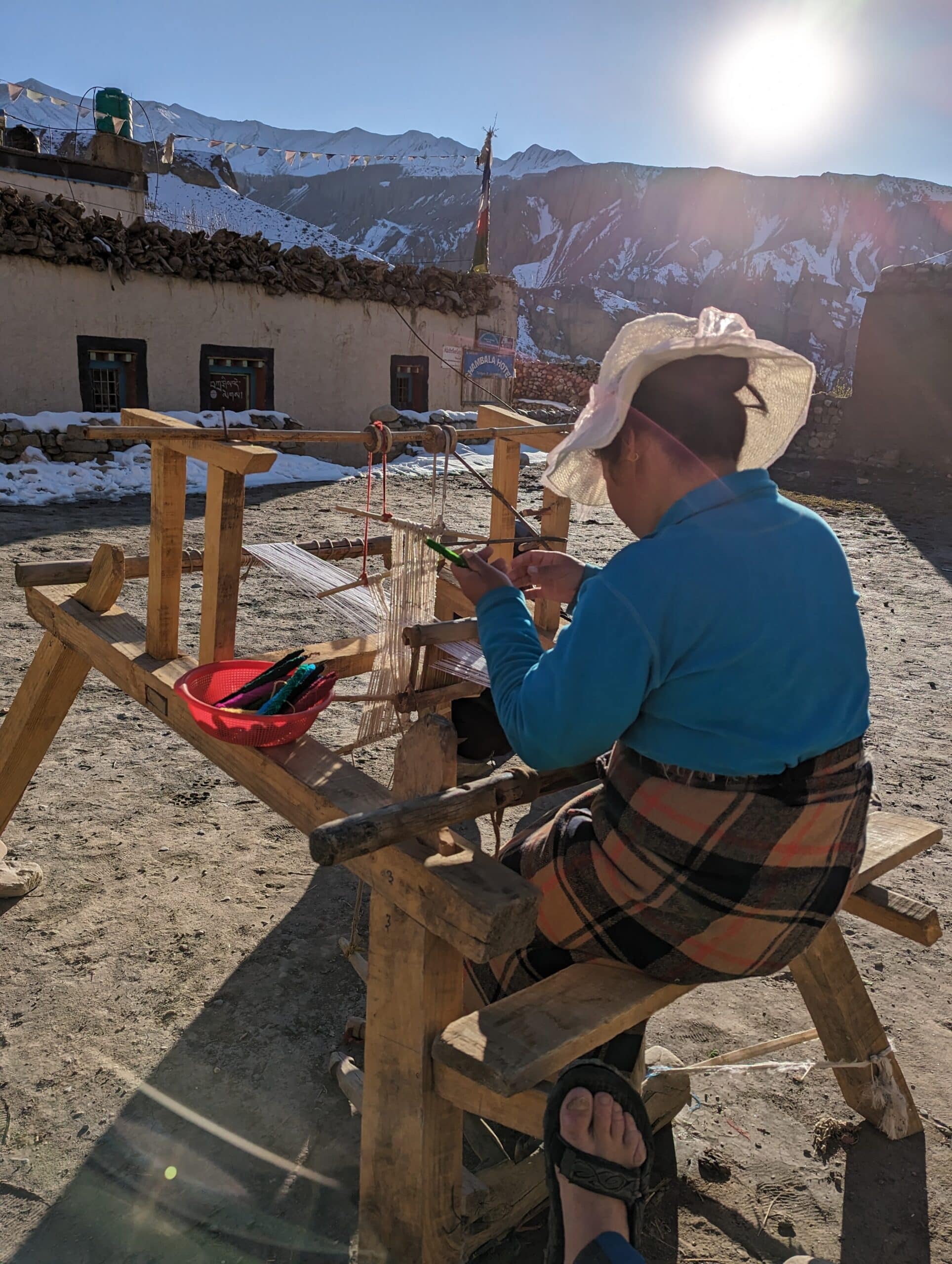 Aujourd’hui sera une journée de repos, il faut dire que cela fait maintenant 20 jours que nous marchons au coeur des montagnes de l’Himalaya en enchainant plusieurs régions. Et bien sur, venir dans ce bout du monde, si isolé, si austère en cette saison, pour y découvrir cette citée, classée au patrimoine mondial de l’UNESCO, vaut bien d’y consacrer une journée. Il fait très froid ce matin, dans la nuit le thermomètre est descendu à – 13°. La ville se vide, dans la matinée, deux dernières jeep doivent quitter Lo Manthnang. La majorité des habitants partent passer l’hiver vers Pokara ou jusqu’en Inde, pour y faire du commerce. Seuls quelques personnes vont rester tout l’hiver pour s’occuper des animaux et déblayer la neige qui s’accumule sur les toit terrasses. C’est le cas dans le seul lodge ouvert, où nous nous sommes basés, la famille part ce matin, Kumar, le propriétaire restera seul tout l’hiver, nous sommes les derniers clients de la saison. Demain la neige est attendue pour la mi-journée. Pour l’heure nous sommes insouciants et tout excités à partir à la découverte. Nous nous enfonçons avec délice dans le dédale de ruelles pavées, nous longeons les fortifications, nous photographions le moindre détail, nous nous immergeons dans les rares instants de vie, de ces habitants. Comme ces mamies népalaises qui se blottissent et se réchauffe à l’abris d’une façade en pierre exposée aux timides rayons du soleil ,de la mi journée, bref nous ne perdons pas une seule goutte de cette envoutante Lo Manthang.