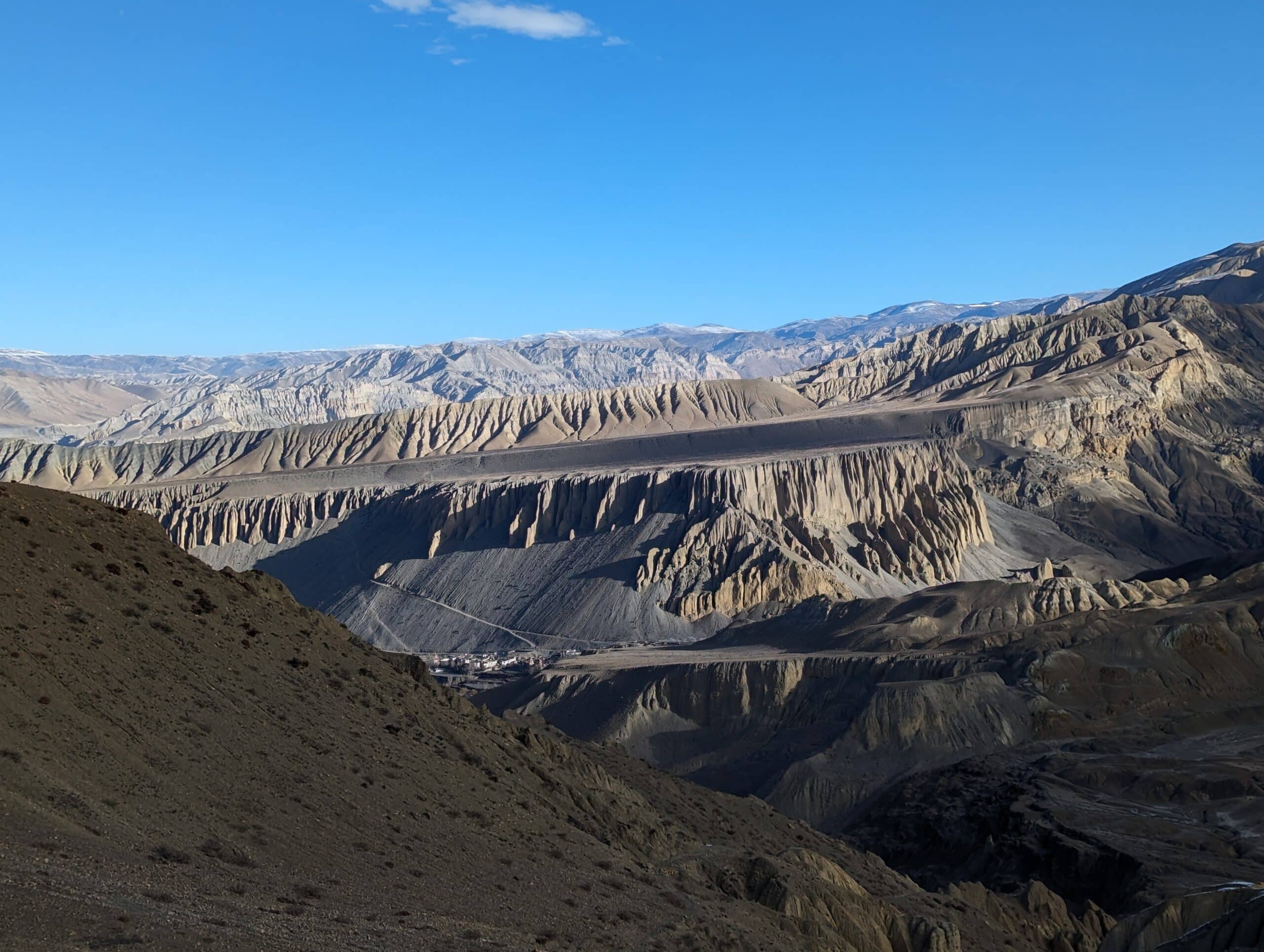 Par un canyon ruiniforme nous grimpons la falaise qui surplombe le village pour prendre pied sur le plateau. Plus loin nous passons au monastère de Ghar Gumba, magnifique havre de paix entouré d’un décor montagneux incroyable . Toujours personne sur le sentier, un autre luxe, ce soir, si tout va bien nous serons à Lo Manthang. Nous avons la sensation étrange d’être des pèlerins, des caravaniers d’antan qui convergent vers la citée millénaire. Les heures passent au fil des pas et de la contemplation. Nous passons enfin au Chogo La à plus de 4000 mètres d’altitude. Devant nous, dans le creux de cet immense altiplano, on aperçois enfin, telle une oasis, la fameuse Lo Mangtang, il nous reste une heure de marche pour y arriver.